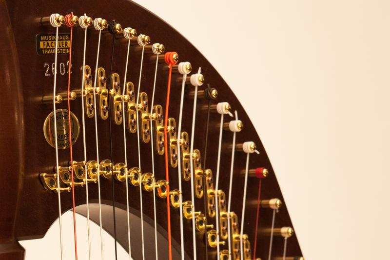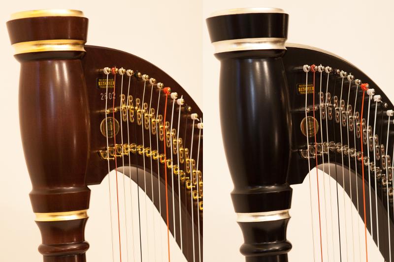 The gold rings complement the gilded mechanics and give the harp a refined look.